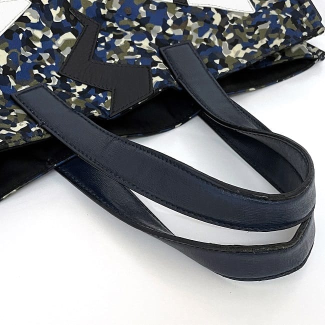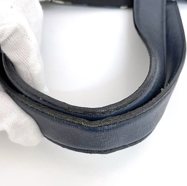 | 詳細説明 | 底部の角とハンドルの縁に擦れやコバ剥がれやひび割れ、表面白いレザー部分に傷汚れ、内側のファスナーポケット付近に薄汚れ、全体的に長期保管臭有、使用感はございますがまだまだお使いいただけるお品物です。 |
