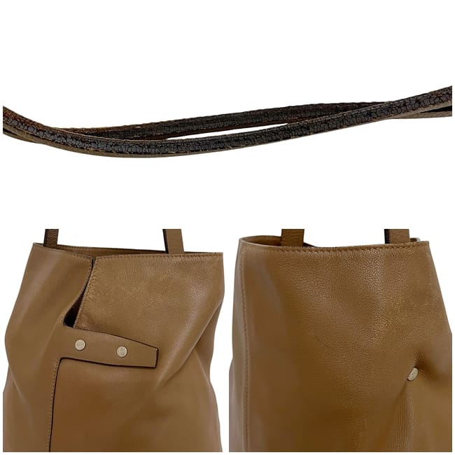 | 詳細説明 | 内側上部に傷や汚れ、ショルダー紐や底部の角や縁に擦れ、底面に汚れ、コバにひび割れ、金具に傷やくすみ汚れ、表面や底面に傷など使用感がございますがまだまだお使いいただけるお品物です。 |
